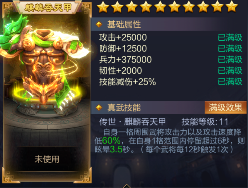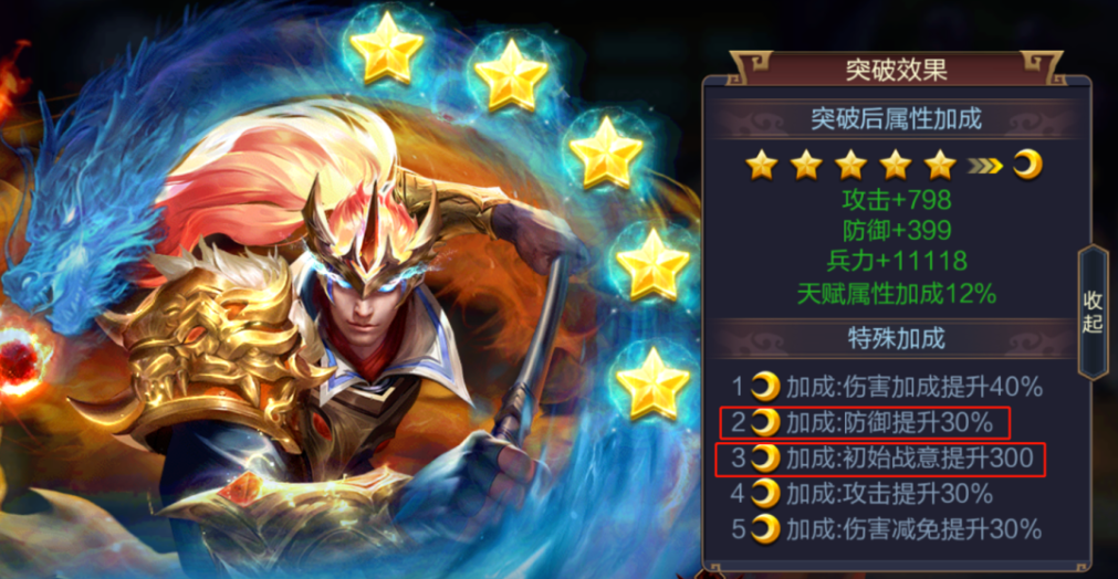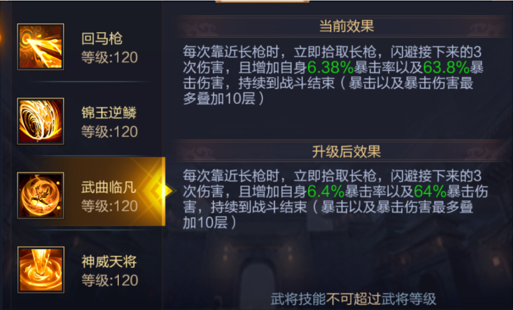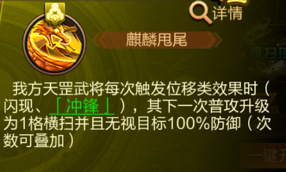 附加效果:闪避下3次伤害。免疫后续的3次控制效果。接下来3次普攻强化为横扫无视100%防御。增加自身19.14【暴击】191.4%【暴击伤害】。恢复最大兵力值38.4%+154200的兵力。恢复240点战意。6秒攻速提高150%。立即清除自身可驱散的所有减益效果。
