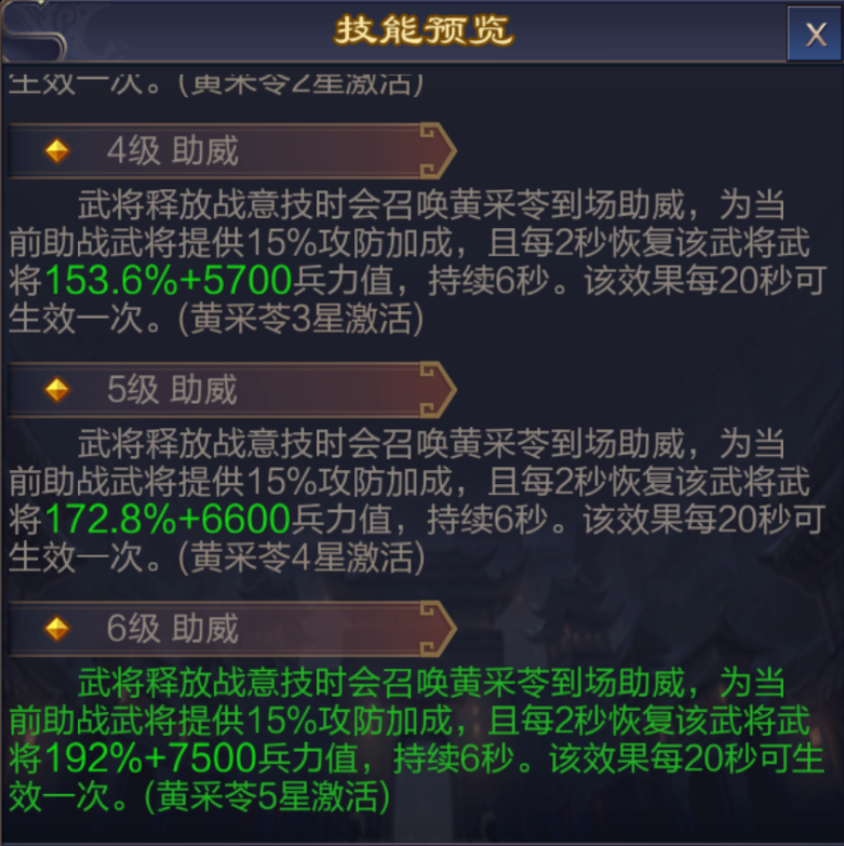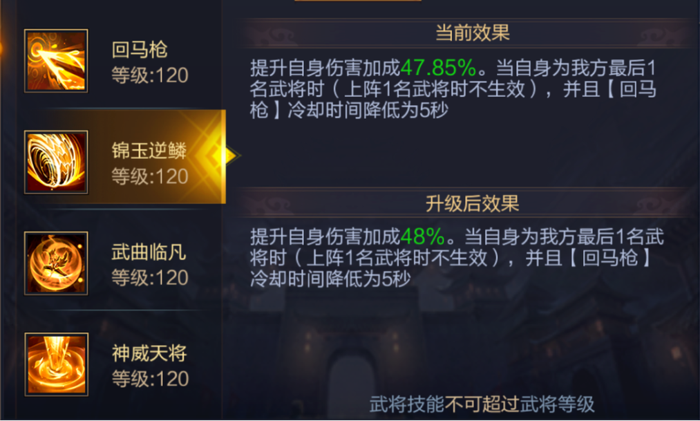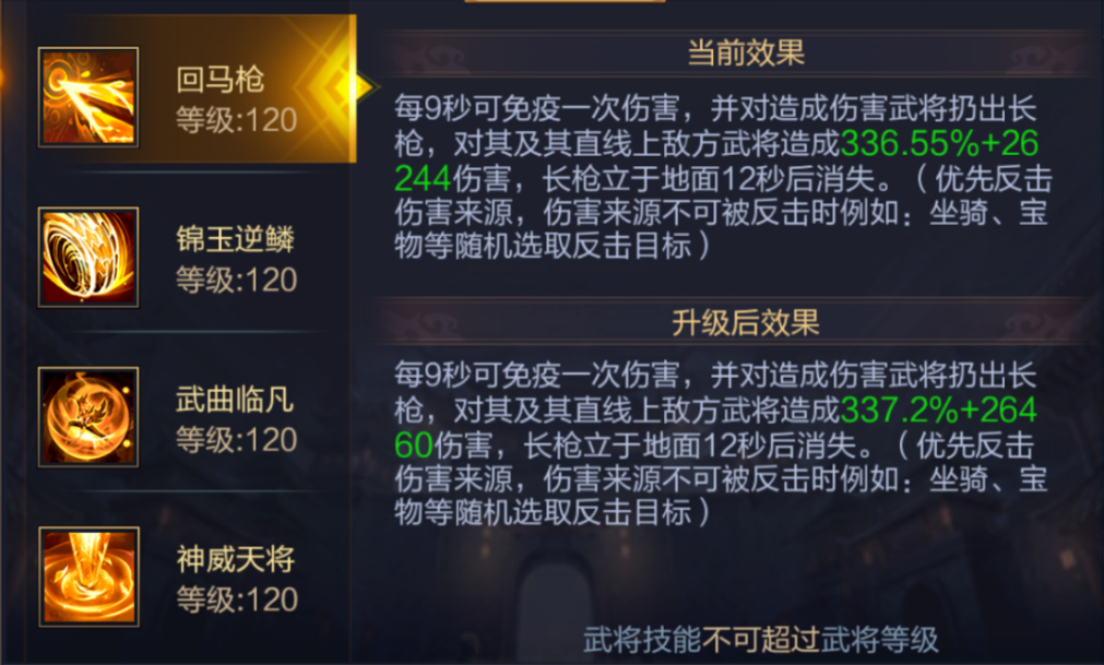 神威天降】:1格内所有敌将收到(327.6%+25725)*敌将数量*丢枪次数,恢复兵力:(最大兵力值的12.8%+51400)*丢枪次数,恢复战意:(80)*丢枪次数