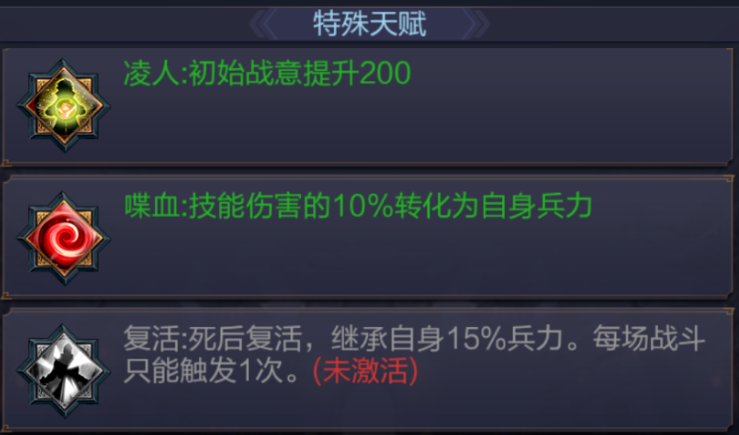 中后期,最少要点出【天赋2】,让大招能在开场速度释放,用来压制敌方。资源足够点出【天赋3】。因为【无双马超缺乏硬减伤,【天赋3】可以从伤害中来吸血,用于弥补身板问题。简单点来说:敌将打马超痛,但是马超可以吸血,约等于你打你的,我吸我的。