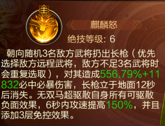 【大招-麒麟怒】:一定丢出3把枪(不管敌方是否有几名武将),枪的位置是在敌将头上1把枪是造成566.79%+11832点【必中】【必暴】伤害。6秒内攻速提高150%,免疫3次控制,立即清除自身所有可驱散减益效果。